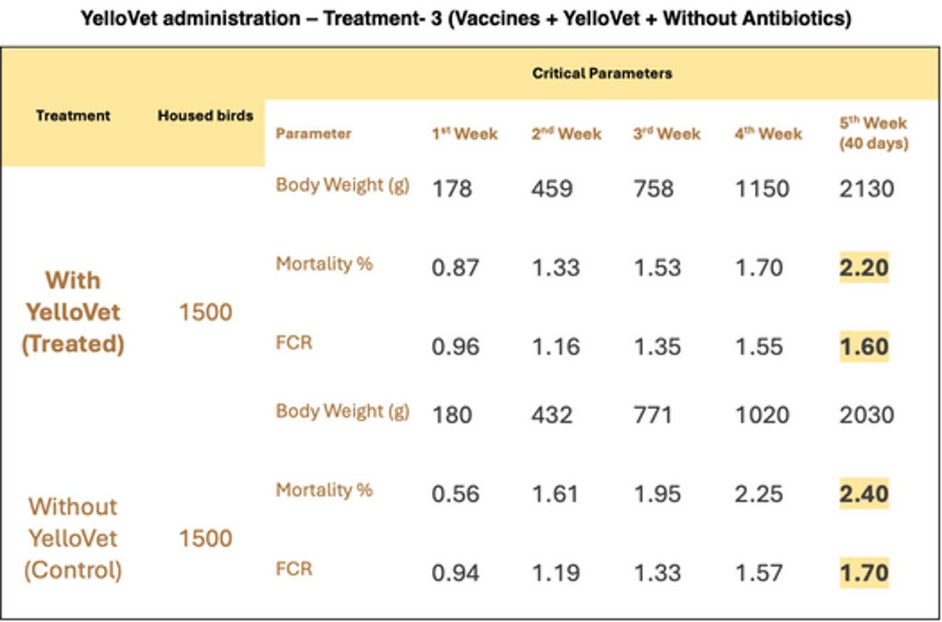 “Using YelloVet made a big difference in bird health and performance. Mortality rates were significantly lower compared to the control groups, and the birds had a much better feed conversion ratio (FCR). On top of that, their immunity was stronger, as seen in higher antibody levels against Newcastle Disease Virus (NDV).Overall, YelloVet helped the birds grow bigger, convert feed more efficiently, and stay healthier with fewer losses.”